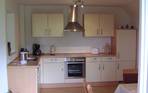 - moderne Wohnküche mit Herd und Backofen, Spülmaschine, Toaster, Wasserkocher, Kaffeemaschine, Kühlschrank mit Gefrierfach